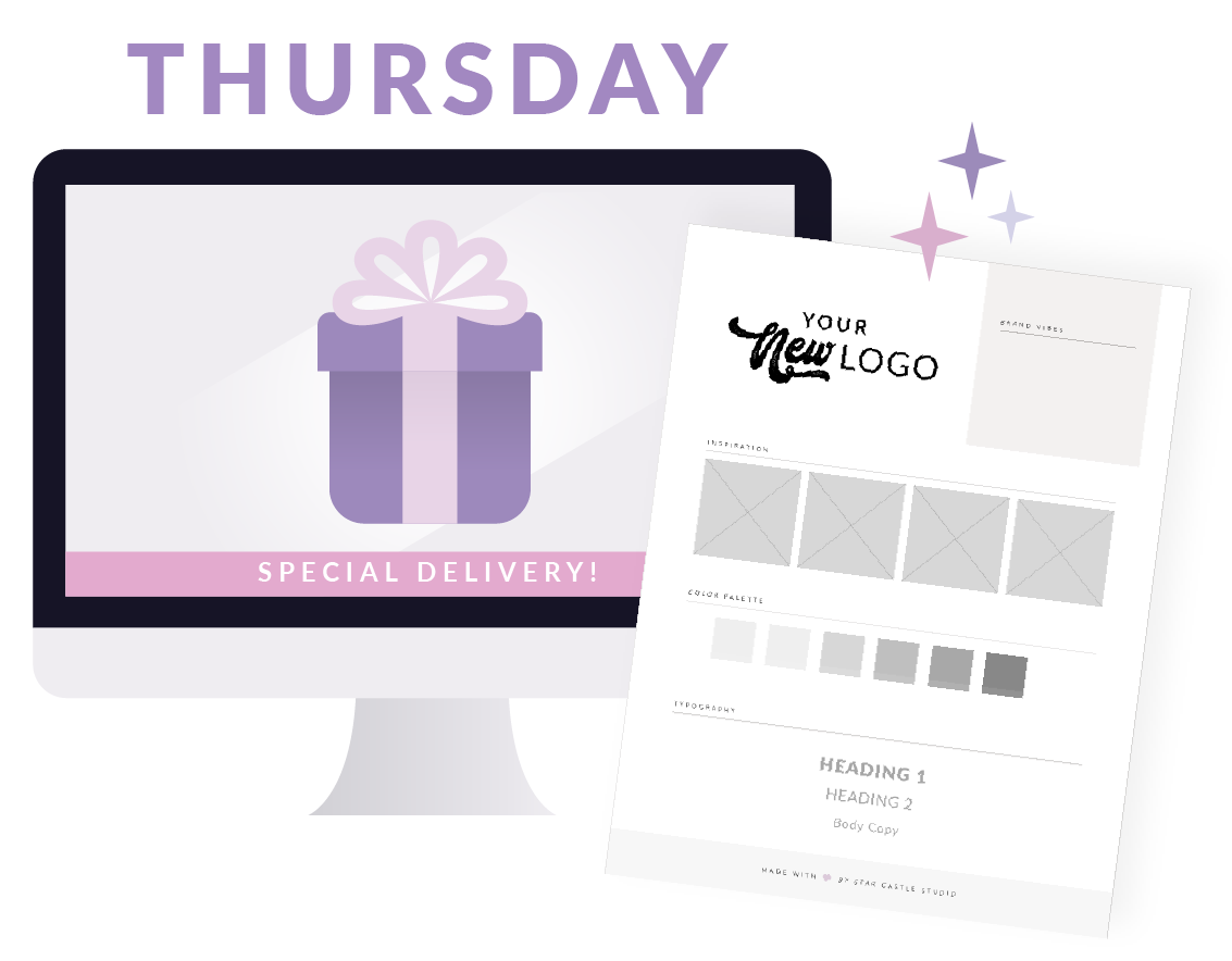 It’s go time! On your official start date, we’ll meet for our kick-off call on Tuesday at 12pm EST to chat all about your amazing ideas and what you hope to build. After our chat, I start working my magic and dive into bringing your totally custom brand to life!